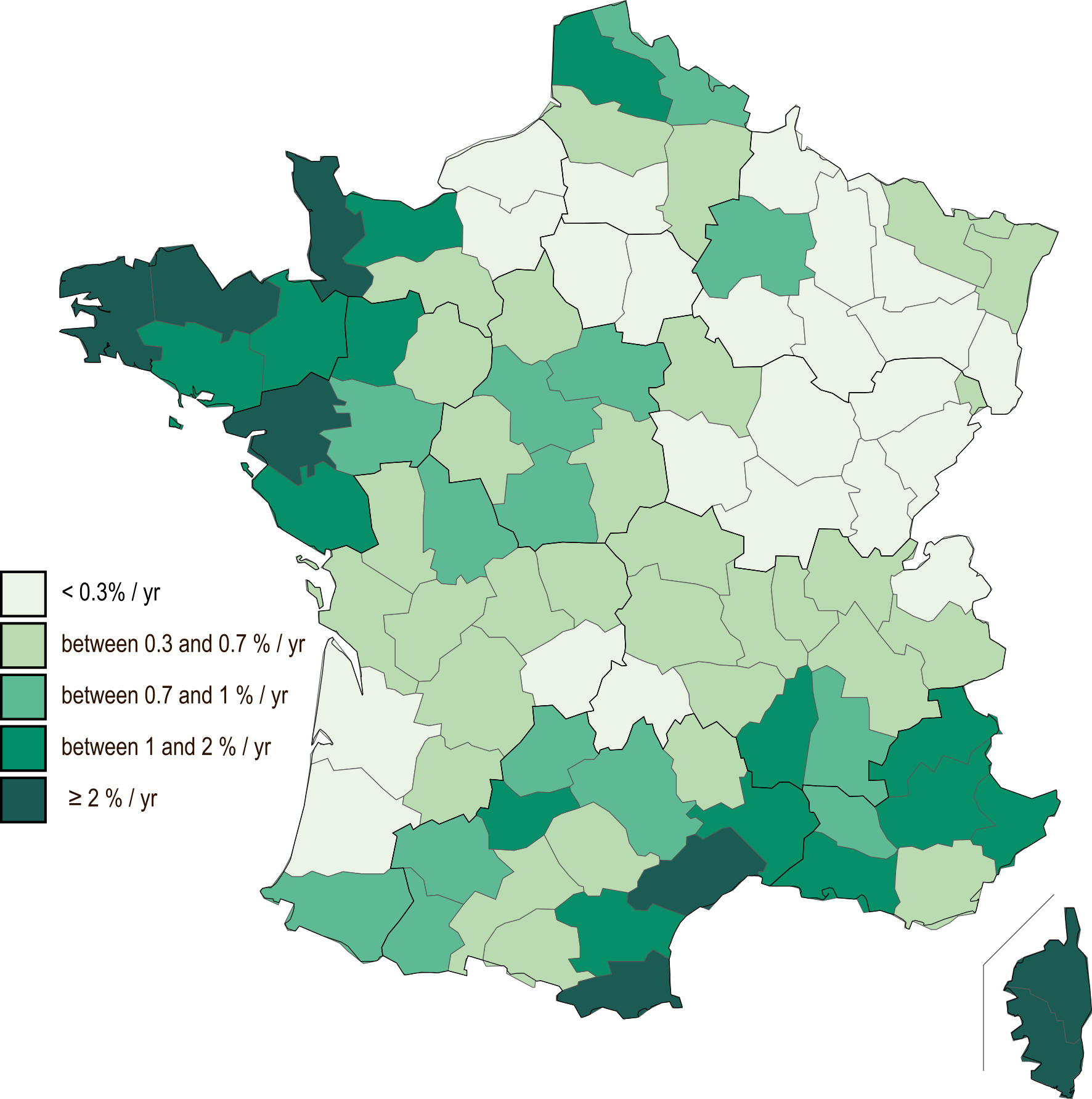 | The increase in forested area is mainly observed in the south (i.e. the mediterannean region and Corsica) and in the northeastern part of the territory (i.e. Brittany and the Pays de la Loire regions). This increase is also observed in the Pas-de-Calais department. In the southeastern part of France, the increase is linked to areas that are no longer used for agriculture and pastoralism. In regions with an historical use of forest, such as northeastern France and landean massif, as well as in the Paris region, which is marked by high urban pressure, the rise in forested area is slower. | ![]() |