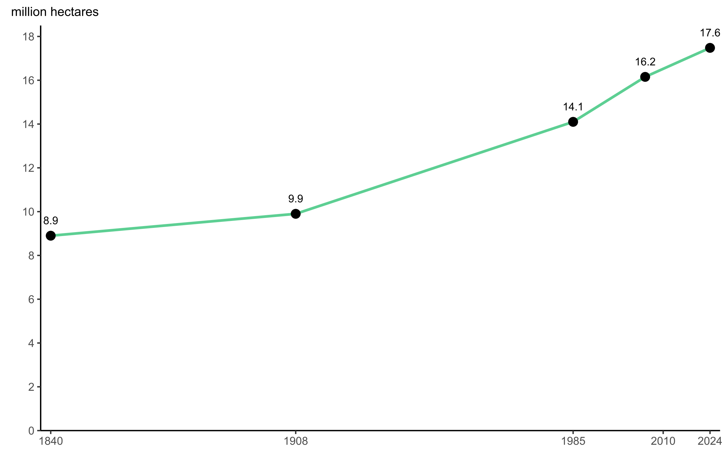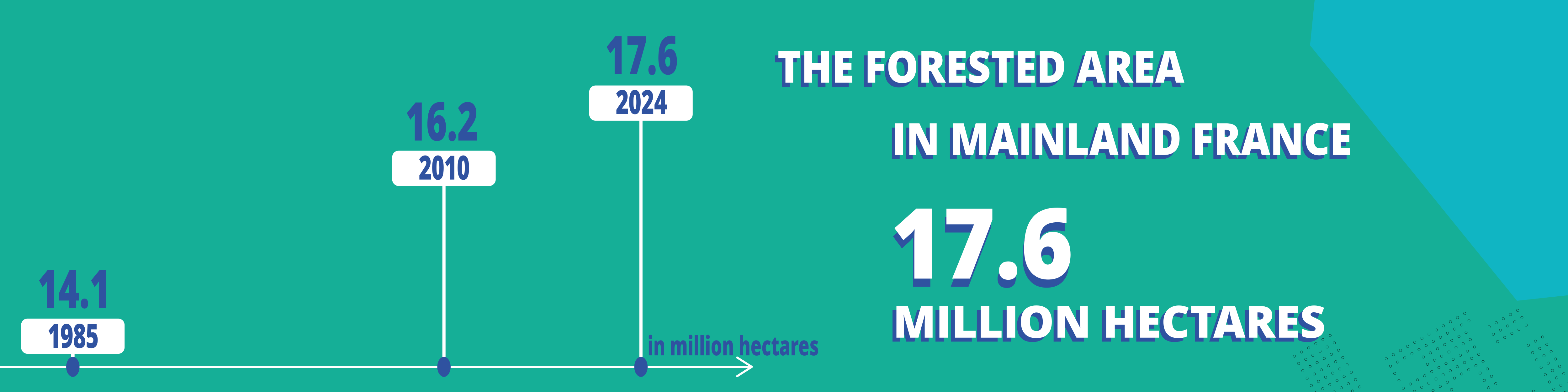 The forested area has constantly expanded since the second half of the 19th century. In 1830, the wooded area in France was estimated to be between 8.9 and 9.5 million hectares (Cinotti, 1996 [2]). By 1985, the forest covered 14.1 million hectares [3]. Since 1985, the annual expansion recorded by the NFI has reached up to 88 000 hectares.