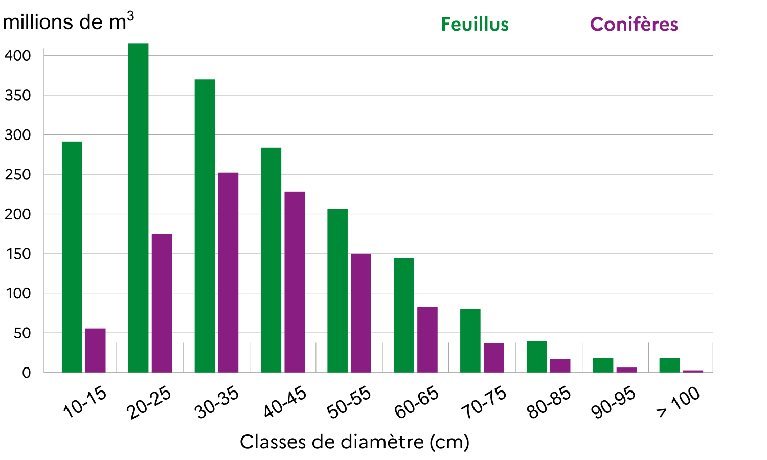 L’augmentation du stock de bois est plus forte pour les feuillus (+ 67 % du stock, soit près de + 750 millions de m³) que pour les conifères (+ 41 %, soit plus de + 290 millions de m³).