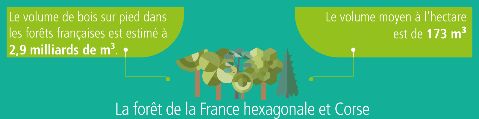 Le volume de bois sur pied des arbres vivants de la forêt de la France hexagonale et Corse est de 2,9 milliards de m3. La forêt privée comprend 72 % du volume de bois sur pied. |
