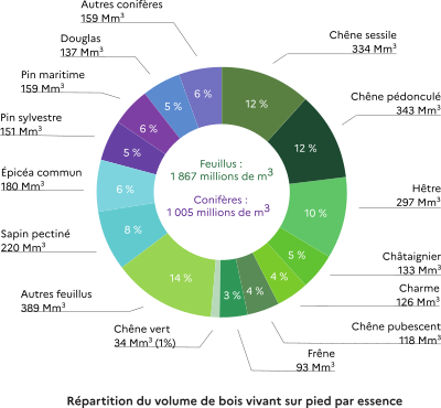 Avec près de 1,9 milliard de mètres cubes, les feuillus représentent près des deux tiers (65 %) du volume sur pied. Les chênes (pédonculé, rouvre, pubescent et vert) sont les essences feuillues les plus représentées sur le territoire (44 % du volume des feuillus). Le hêtre représente 10 % du volume de bois total. Les conifères forment un milliard de mètres cubes. L’épicéa commun et le sapin pectiné représentent à eux deux 40 % du volume des conifères. |