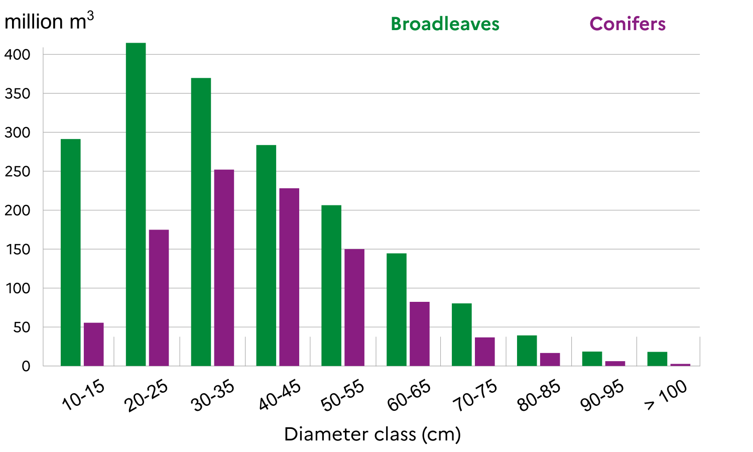 For broadleaves, trees with a diameter below 37.5 cm account for more than 50% of the growing stock volume. For conifers, 80% of the volume is composed of trees with diameters between 17.5 and 57.5 cm.