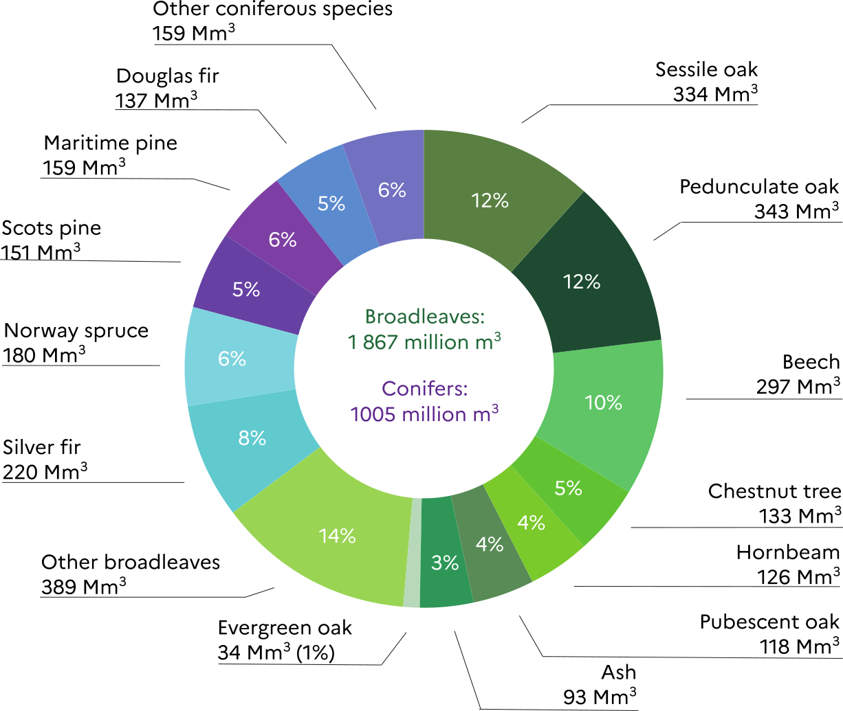 Broadleaves (hardwoods) account for almost 2/3 of the growing stock, which represents 1.9 billion m3. Oaks (including pedunculate, sessile, pubescent and evergreen oaks) make up more than a quarter (29%) of the total growing-stock and 44% of the hardwoods’ growing stock. Beech accounts for 10% of the total growing stock. Conifers (softwoods) account for 1 billion cubic meter. Norway spruce accounts for 6% of the growing stock and silver fir for 8%. Together, Norway spruce and silver fir represent 40% of the softwoods in terms of growing stock. |